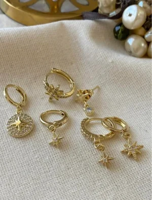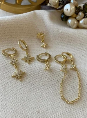 Çoklu 14K Taşlı Kuzey Yıldızı Küpe Seti
