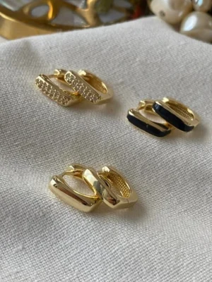 Çoklu 14K Taşlı Siyah Mineli Mini Kare Küpe Seti