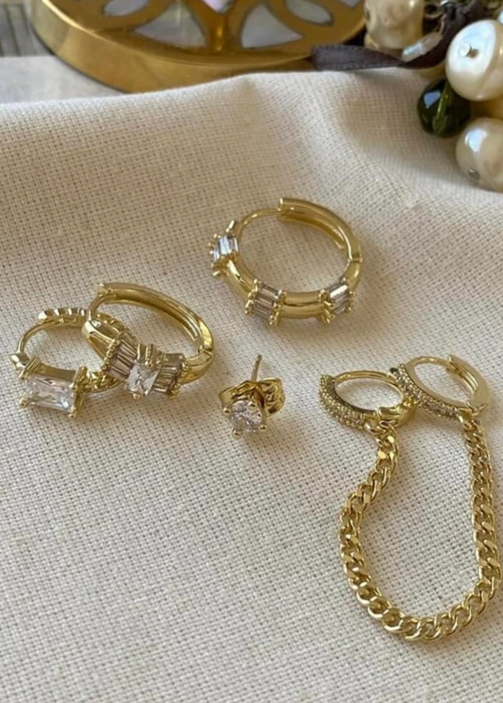 Çoklu 14K Zincir Detaylı Baget Taşlı Halka Küpe